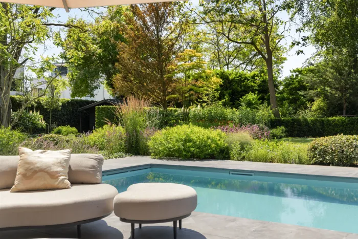 De winnende tuin is een schoolvoorbeeld van wat er gebeurt als vakmanschap, visie en beplanting in balans zijn. Het ontwerp combineert strakke lijnen met volwassen groen en een zwembad dat volledig is geïntegreerd in het landschap. Geen overdaad, geen opsmuk, maar een buitenruimte waarin alles klopt.