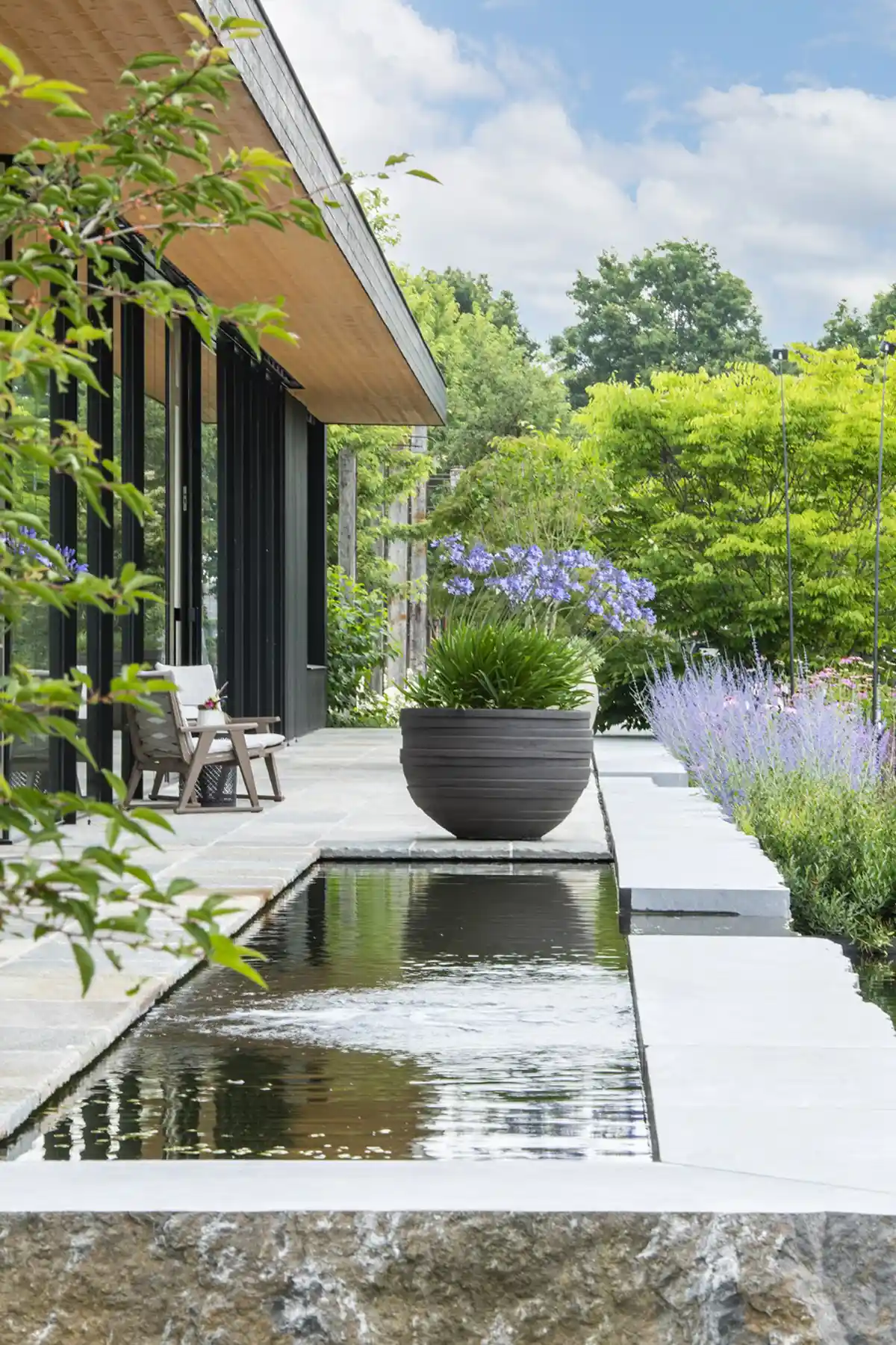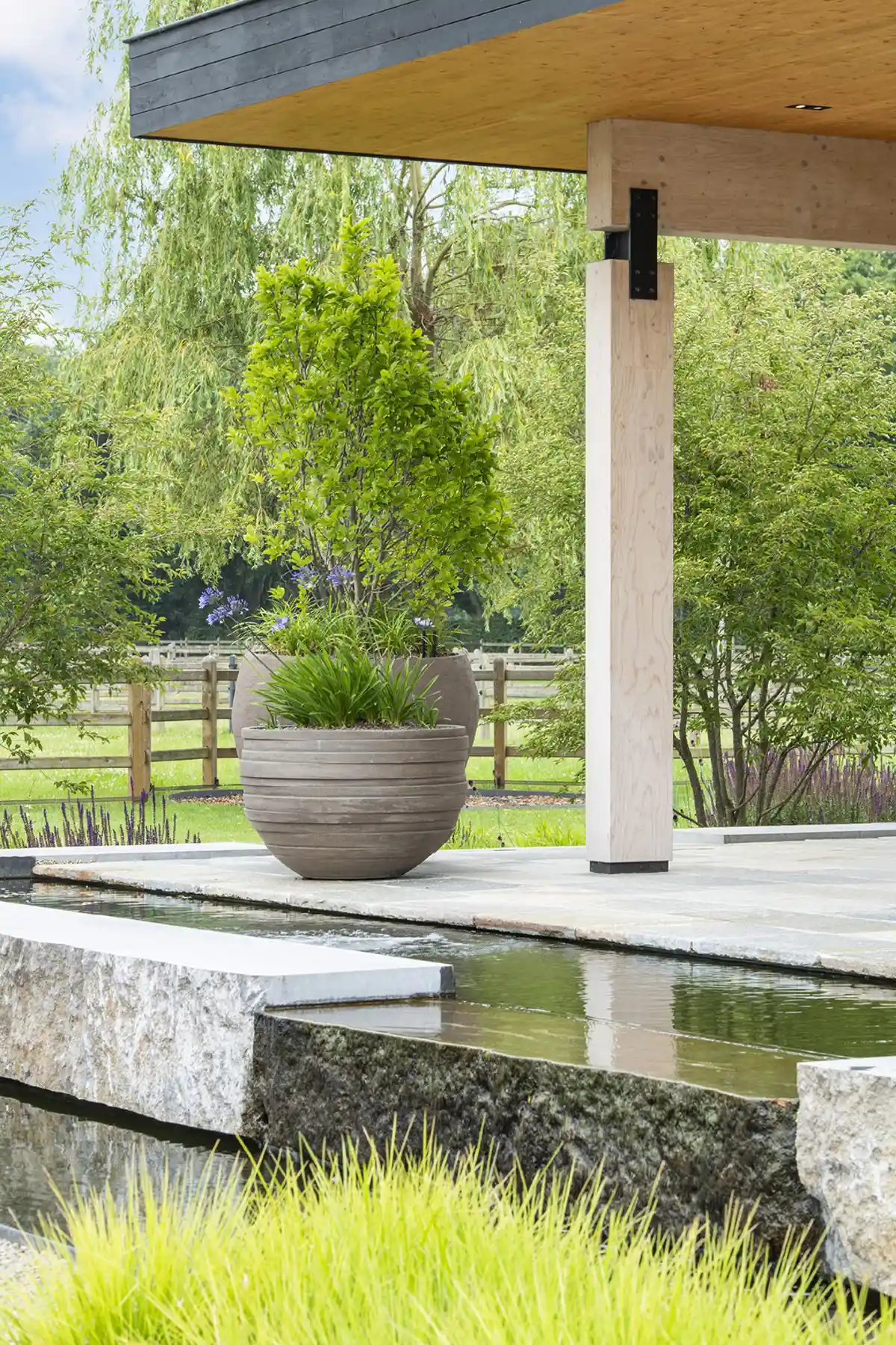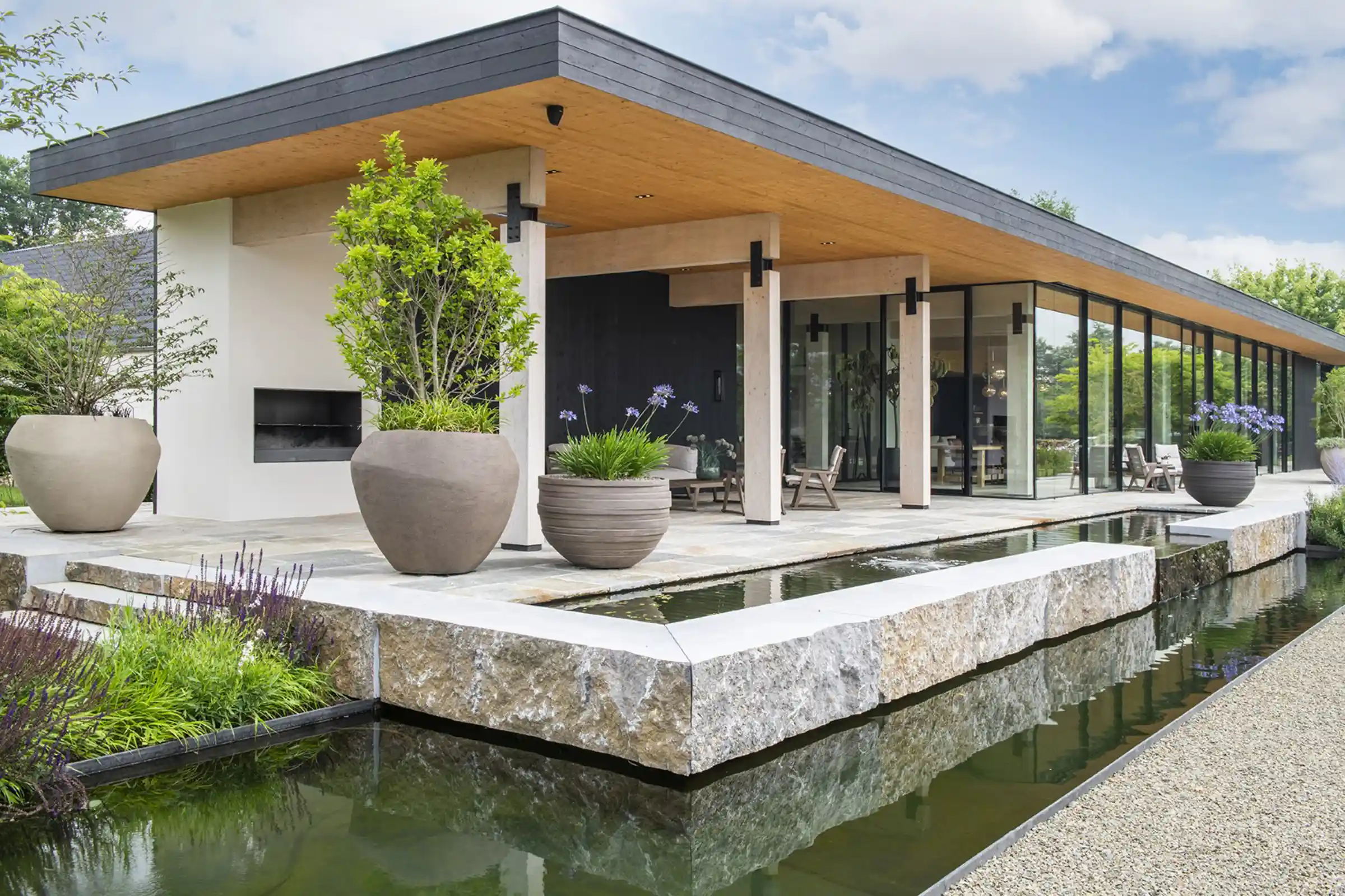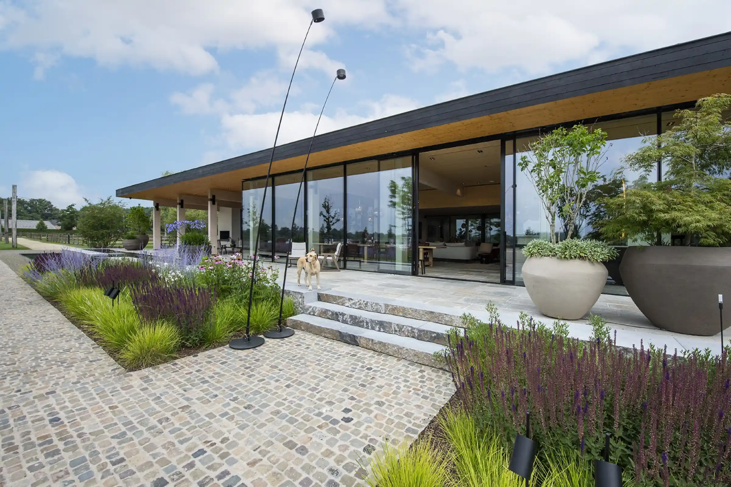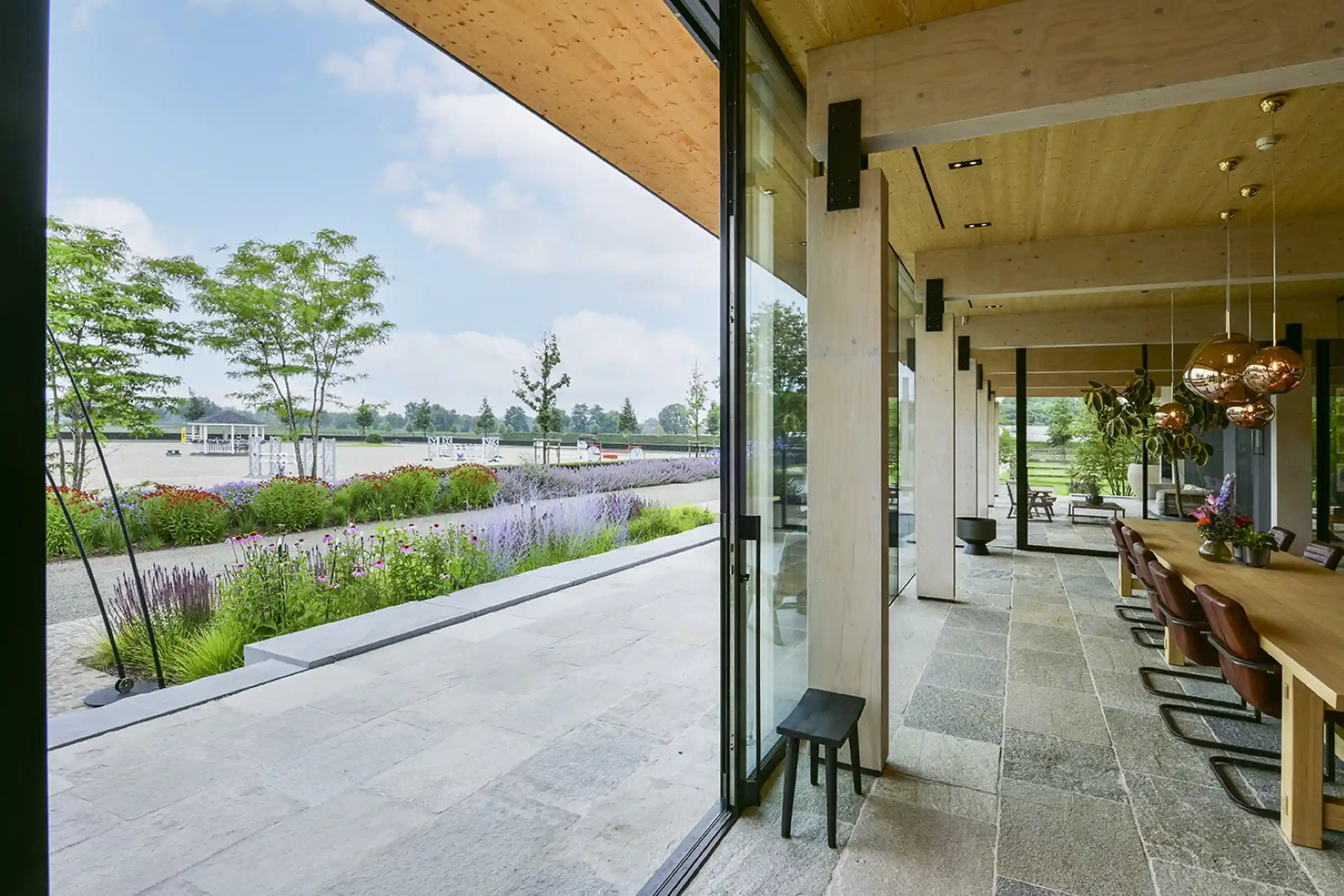 Een belangrijk kenmerk van de buitenruimte zijn de massieve natuurstenen blokken en het niveauverschil dat is opgevangen door een waterpartij. De ondiepe waterpartij grenst aan het terras en loopt via een waterval over in een diepere vijver. Deze overgang creëert een visuele barrière tussen de manege en de ontvangstruimte zonder afbreuk te doen aan het esthetische aspect. Monumentale materialen worden gecombineerd met groene elementen om een zachte, natuurlijke uitstraling te behouden en niveauverschillen op speelse wijze op te vangen.