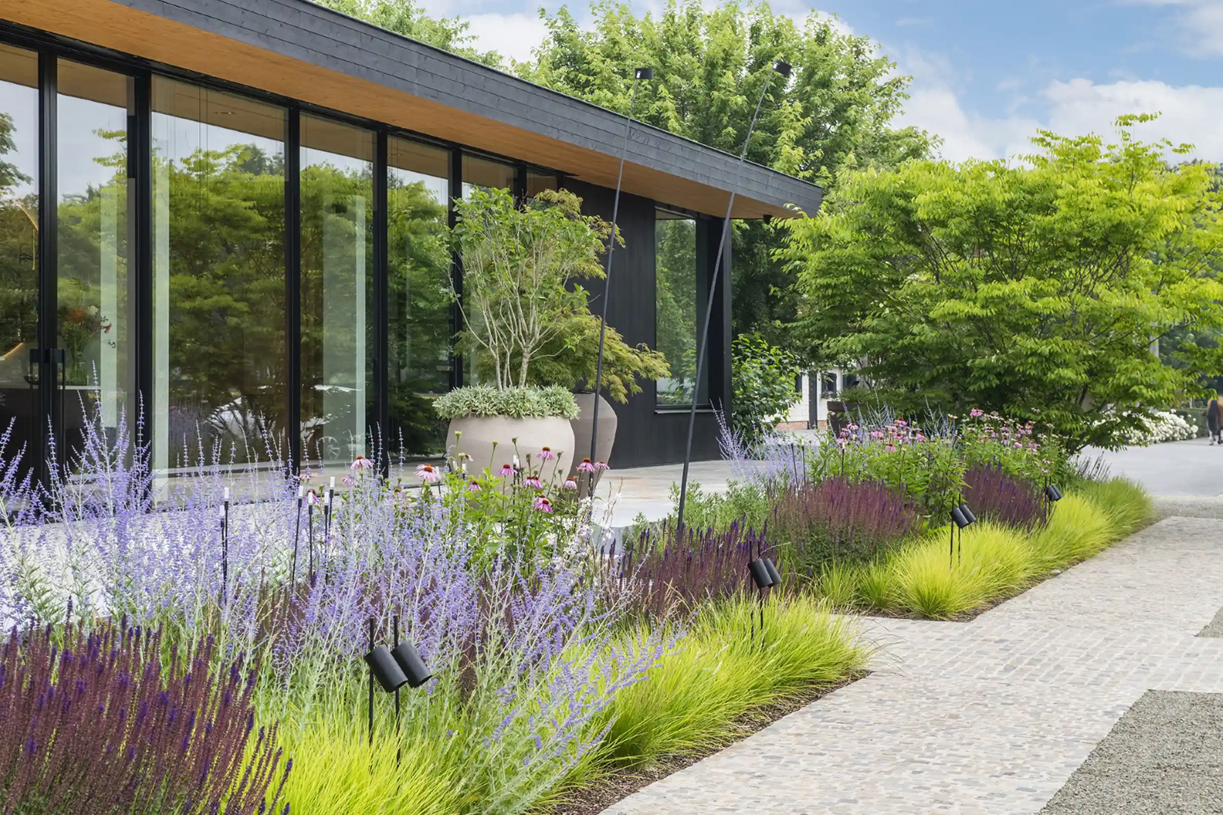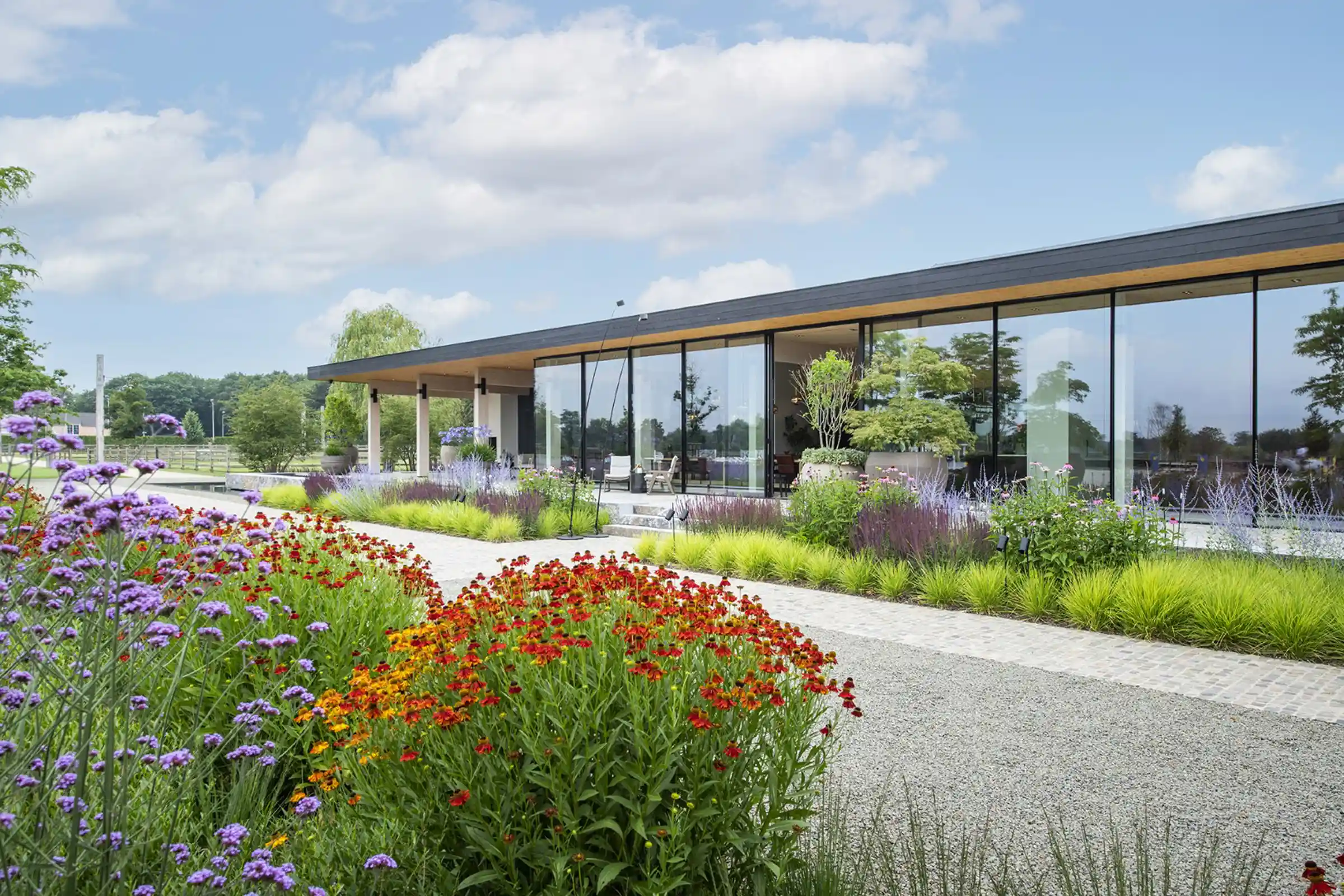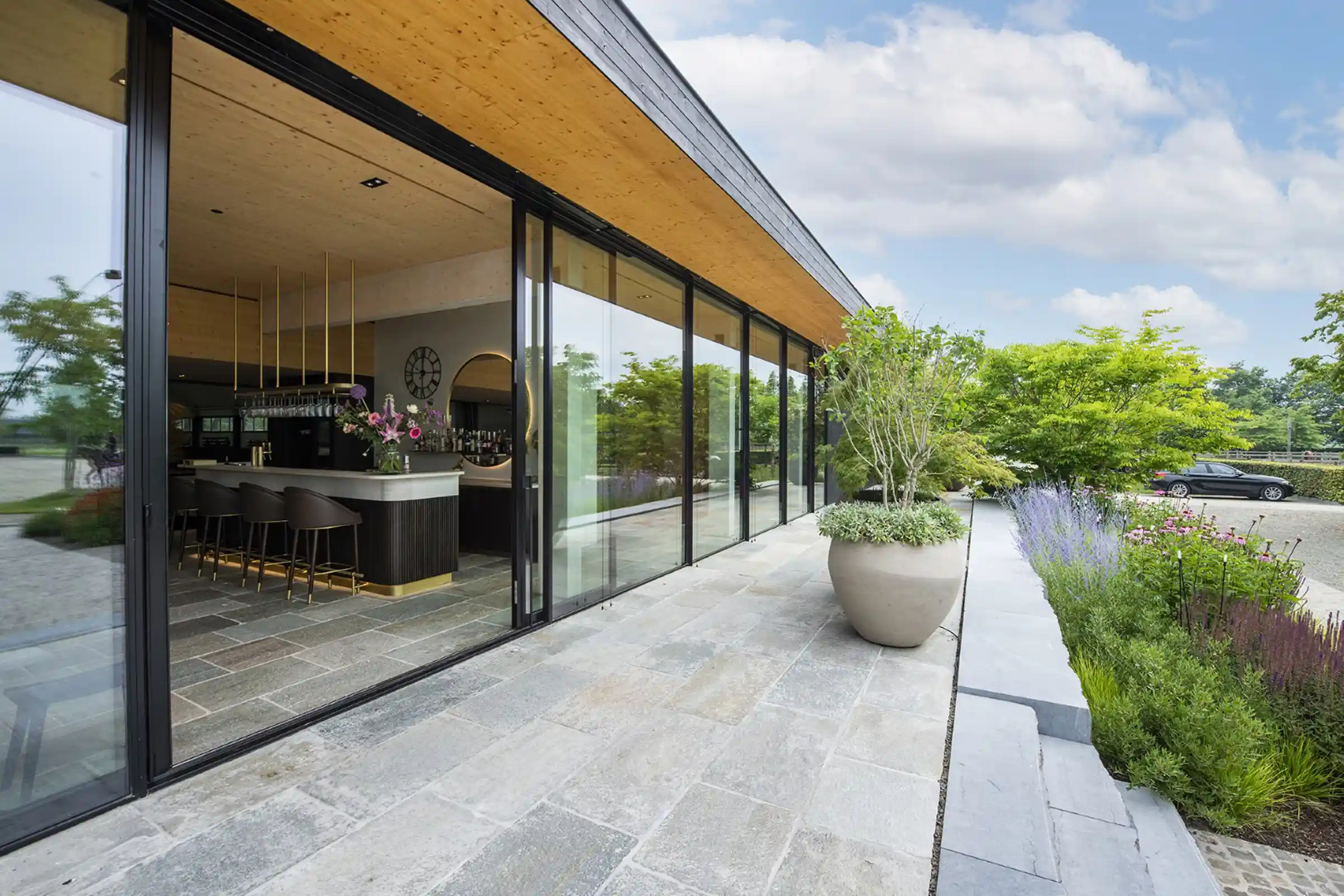 De buitenruimte is ontworpen om multifunctioneel en een verlengstuk van het interieur te zijn. Zo zijn de granieten stenen zijn van binnen naar buiten doorgetrokken. Deze consistente materiaalkeuze verbindt de binnen- en buitenruimte. Naast de open uitstraling, die wordt versterkt door bloeiende beplanting langs de paden, worden bezoekers uitgenodigd tot ontspanning bij de verschillende zitgelegenheden. Bovendien brengen de diverse keramische potten de groene elementen van de borders naar het terras.